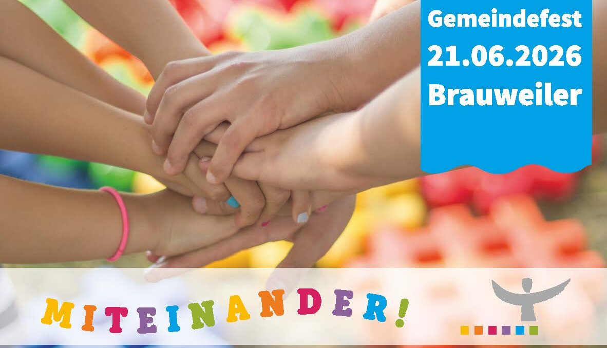 Das diesjährige Gemeindefest feiern wir am 21. Juni 2026 im Ev. Gemeindezentrum Brauweiler. Los geht es mit einem Familiengottesdienst um 10.15 Uhr. Mit Musik, Mitmachangeboten, leckerem Essen und Getränken, einer Kaffeelounge sowie netten Gesprächen wird das Fest viel zu schnell vorüber sein. Gegen 17.00 Uhr lassen wir den Tag ausklingen. Ganz unter dem Motto „Miteinander“ suchen wir für das Fest noch fleißige Hände. Hier können Sie sich in die Helferlisten eintragen.